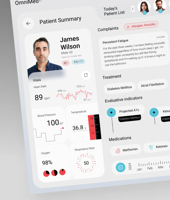 OmniMed is a hospital-grade clinical dashboard used by doctors during live patient consultations. While the existing system stored comprehensive patient data, it failed to support how doctors actually think and make decisions under time pressure. Information was fragmented across sections, forcing doctors to manually reconstruct patient history during follow-ups and complex diagnoses.